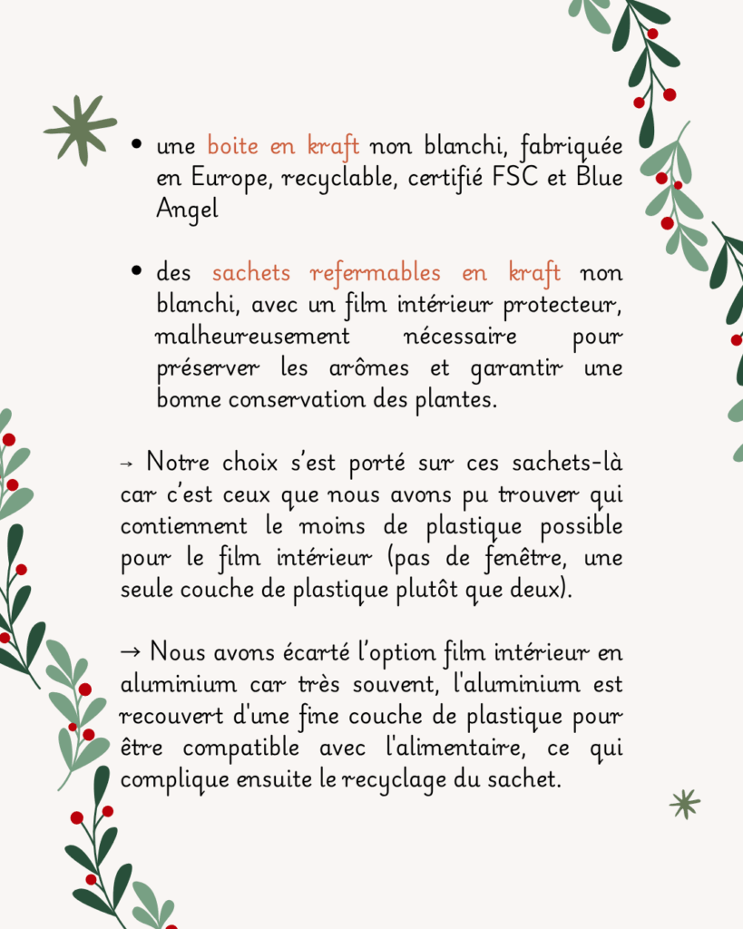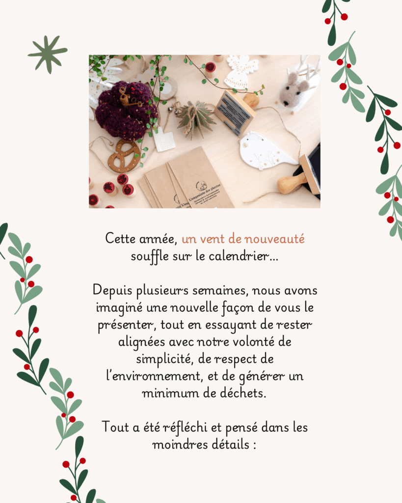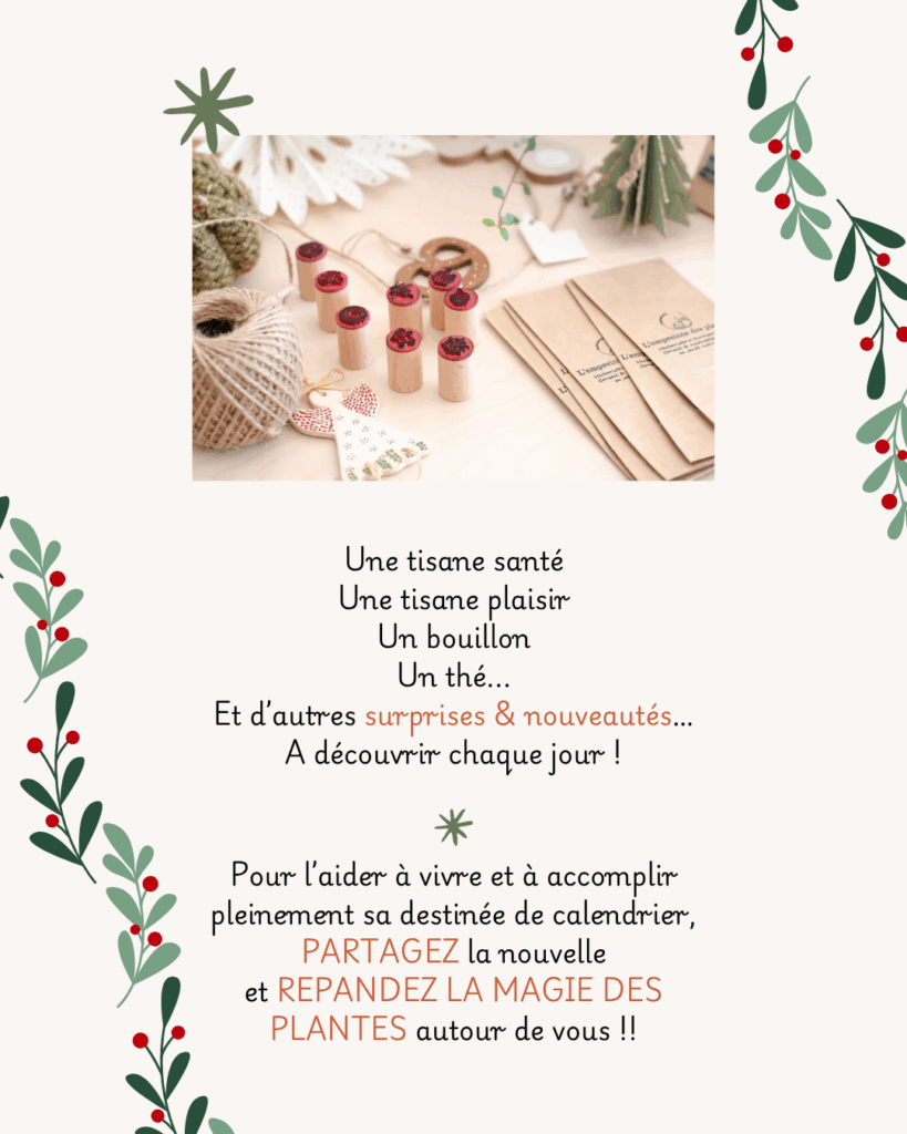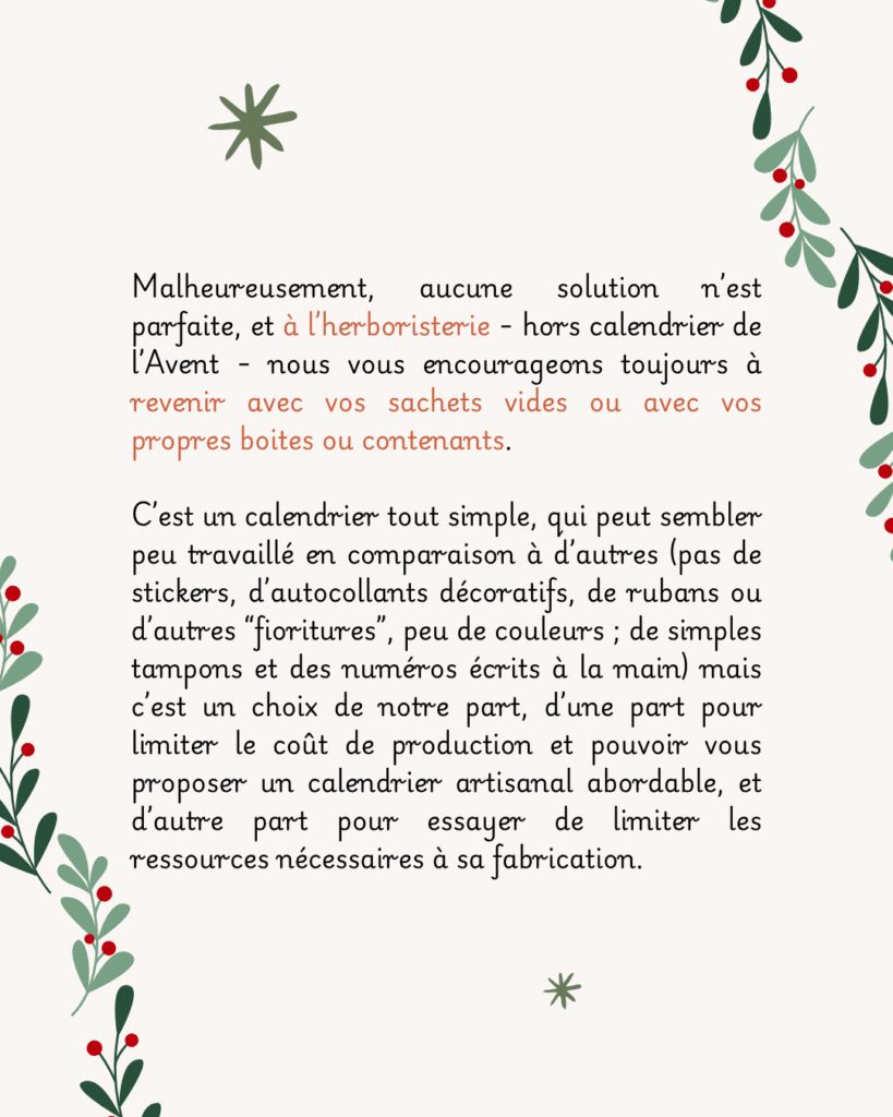 En 2021, nous avons imaginé un calendrier pas comme les autres… le premier calendrier de l’Avent dédié aux plantes en vrac et de fabrication artisanale. Entièrement fait-main, par nos soins, simple dans sa présentation pour limiter les déchets et les ressources nécessaires à sa fabrication.